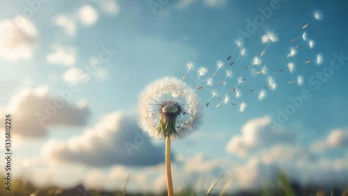 Dandelion seeds drift gently in the breeze under a clear blue sky