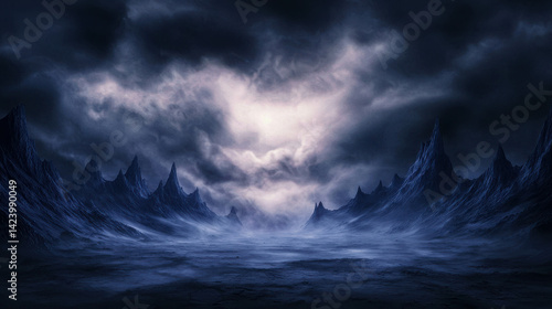 Dark and Mysterious Landscape with Clouds and Mountains in Dramatic Atmosphere