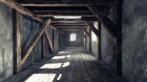 Dark, Atmospheric Corridor: Aged Wooden Beams, Stone Walls, and a Single Window