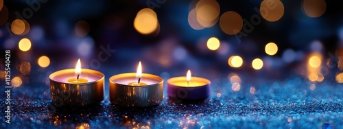 Dark background with candles and bokeh lights Christmas, Easter, or Hanukkah concept banner Abstract dark blue, purple, and gold background Generative AI