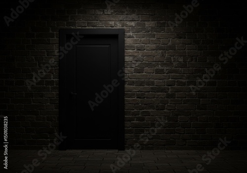 Dark Black Door on Brick Wall with Shadow and Empty Space Photo