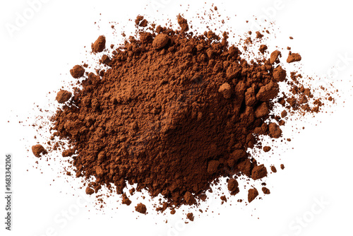 Dark brown cocoa powder pile, top view. Scattered particles