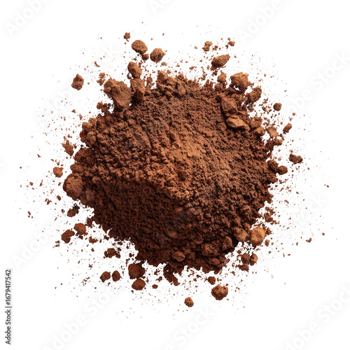 Dark brown cocoa powder, piled high in a scattered, radiating pattern against a black background