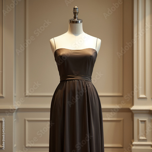 Dark brown satin spaghetti strap evening gown on mannequin in elegant room