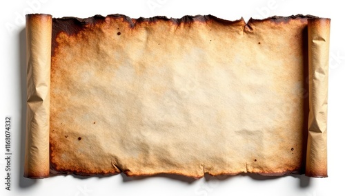 Dark brown, unevenly burnt paper border, clean white backdrop, flame, photography, singed