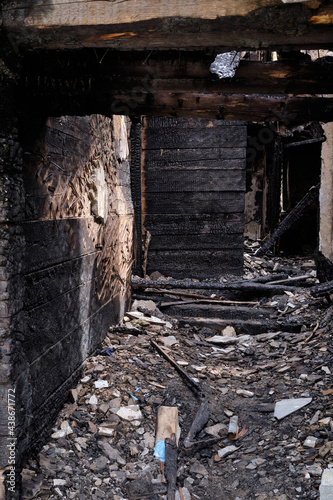 Dark burnt wooden house corridor after fire