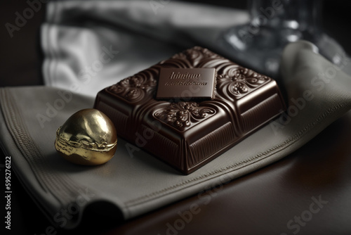 Dark chocolate. A large bar of chocolate on the table. Illustration for Chocolate Day. Generated by AI