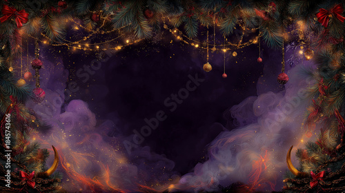 Dark Christmas Vignette Border With Krampus Horns And Glowing Lights, Eerie Festive Christmas Frame With Krampus Horns And Mystic Smoke