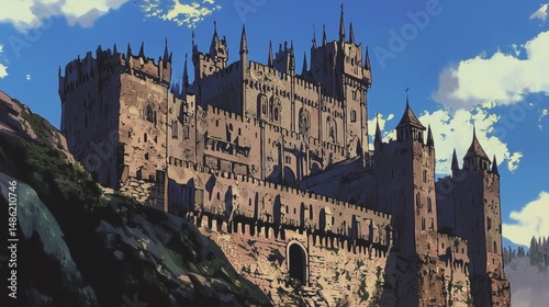 Dark fantasy European medieval castle illustrated in a classic anime style.