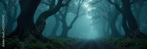 Dark forest with misty atmosphere and twisted trees, nature, forest