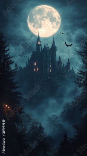 Dark Gothic Castle Night Scene Full Moon Bats Mysterious Forest Art Scary Eerie Trees Magic Spooky