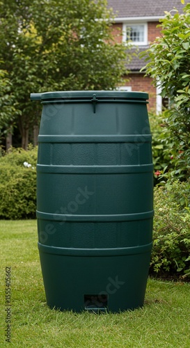 Dark Green Rain Barrel in Lush Garden Setting