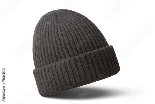 Dark grey knitted beanie hat isolated on transparent background, winter wear