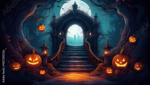 Dark Halloween background with an entrance to a secret chamber and some stairs 21