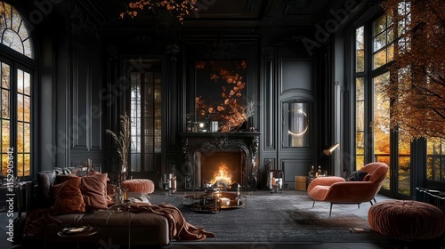 Dark, luxurious living room with fireplace, autumnal views, and plush furniture.