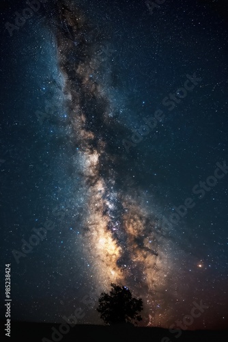 Dark night sky with Milky Way galaxy shining brightly. Vertical shot of starry sky with cosmic glow illuminating landscape. Nature beauty in darkness, universe splendor on display.