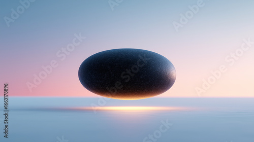 Dark oval stone floats over water at sunset, with pastel sky background. Suitable for nature, fantasy, or tranquil themed designs or concepts.