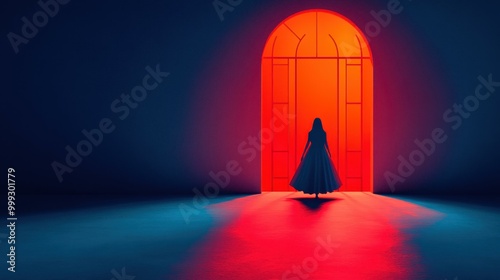 Dark room with a ghostly female figure, moonlight casts eerie shadows, creating a haunting atmosphere in the illustration.