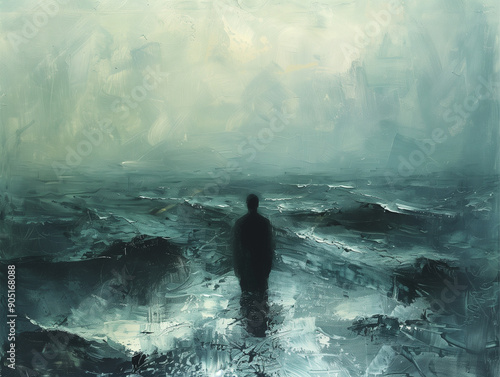 Dark silhouette of a lonely person in a foggy sea landscape. Conceptual image. Concept of depression, emotional pain, isolation, loneliness and mental health issues