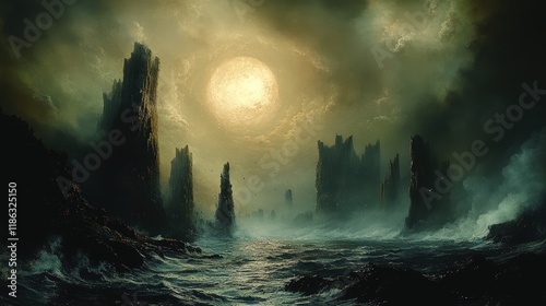 Dark, stormy sea; ominous, tall rock formations; pale sun.
