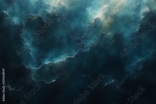 Dark teal nebula with glowing clouds and cosmic dust.