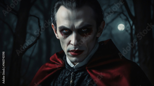 Dark Vampire in a Forest with Red Cloak and Full Moon on Halloween Night
