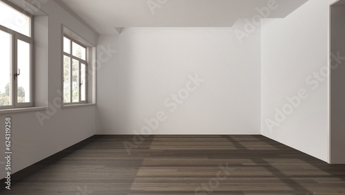 Dark wooden empty room interior design, open space with parquet floor, panoramic windows, white walls, modern contemporary architecture concept idea