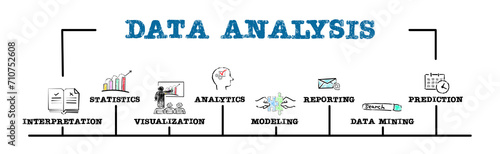 Data Analysis Concept. Illustration with keywords and icons. Horizontal web banner