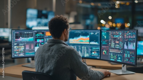 Data analyst working with multiple monitors in a modern office environment