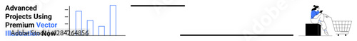 Data chart bars and a person interacting with a shopping cart and computer screen. Ideal for e-commerce strategy, data analysis, marketing, online shopping, customer journey, sales trends, flat