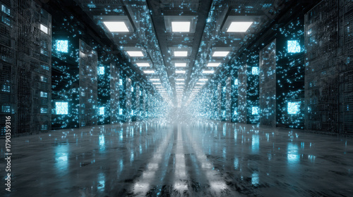 Data transferring in futuristic server room corridor