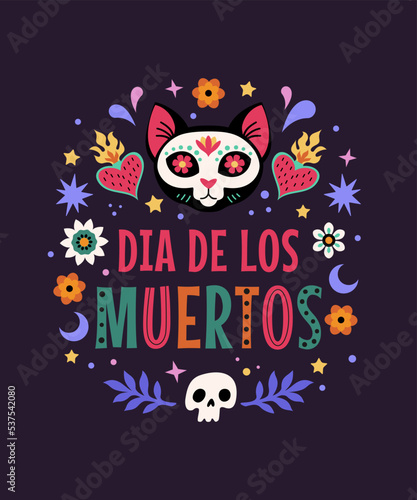 Day Of The Dead greeting card. Vector illustration in flat cartoon style of Mexican traditional festive symbols: skulls, hearts, flowers, and decorative text. Isolated on a dark background