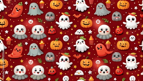 Day of the Dead seamless pattern with skulls and flowers on a red background. Traditional Mexican Halloween design