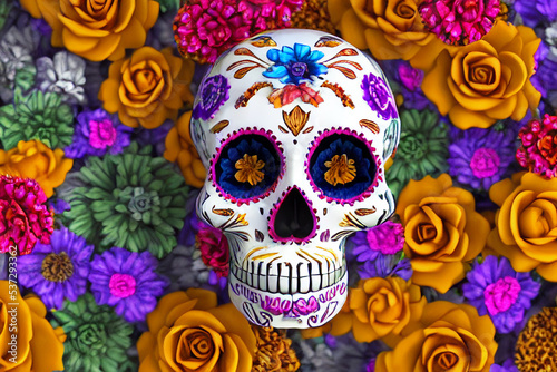 Day of the dead, sugar skull with calaveras makeup, aztec marigold flowers, Mexican greeting card