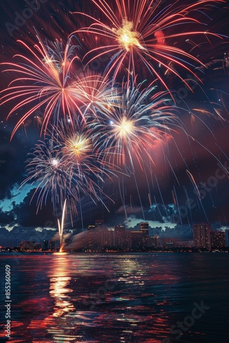 Dazzling fireworks display over Miami skyline reflecting on water during nighttime celebration