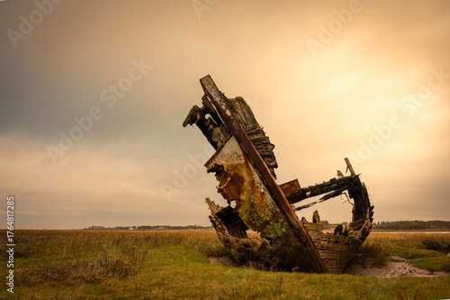 Decaying wooden shipwreck on salt marsh near Fylde under overcast sky