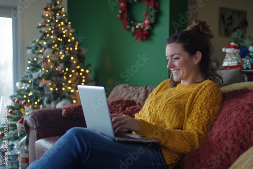 December days at home. young woman watching movies on a laptop during the Christmas holidays