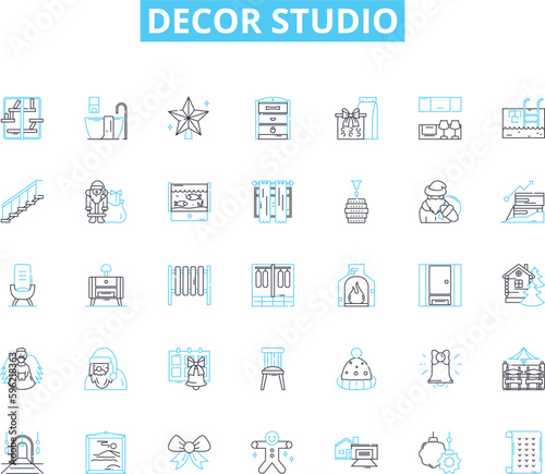 Decor studio linear icons set. Furniture, Textiles, Lighting, Arrk, Accessories, Wallpaper, Rugs line vector and concept signs. Upholstery,Cushions,Mirrors outline illustrations