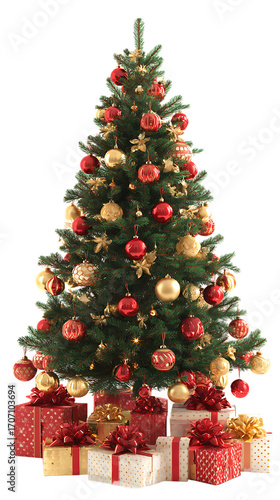 Decorated christmas tree isolated on transparent background with red and gold ornaments and presents underneath the tree