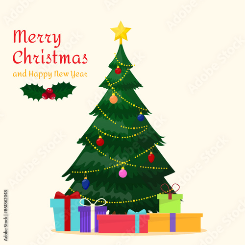 Decorated christmas tree with presents. Merry Christmas and a happy new year. Flat style vector illustration.