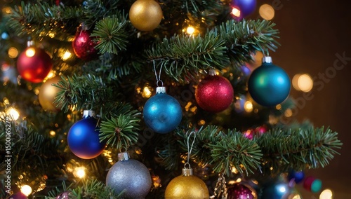 Decorated Christmas tree with twinkling lights and colorful ornaments