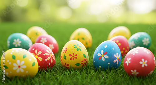 Decorated Colorful Easter Eggs on Grass with Floral and Polka Dot Patterns – Festive Spring Close-Up