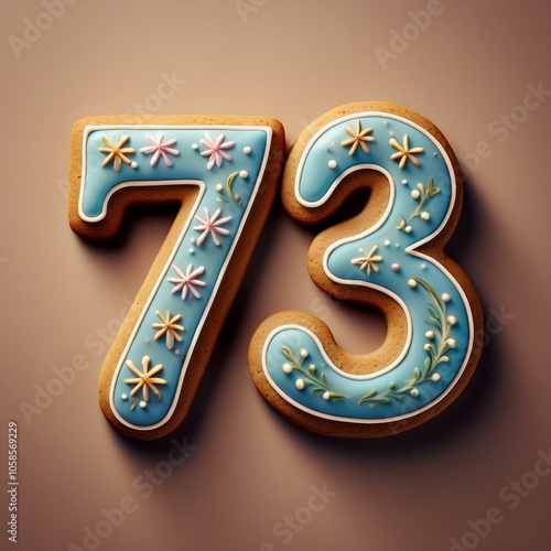 Decorated cookie, number 73, image for birthday or anniversary celebration