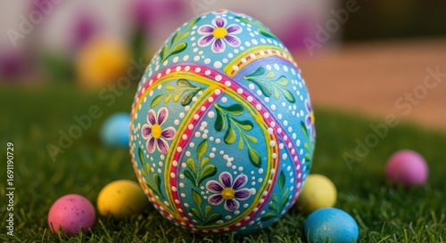 Decorated Easter egg with floral patterns on grass with other eggs.