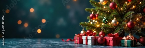 Decorated fir tree with presents & twinkling lights Merry Christmas & Happy New Year card , decoration, christmas