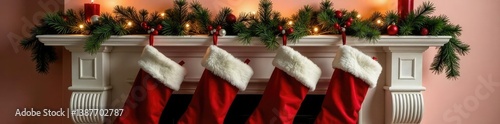 Decorated mantel with red and white stockings and garland, holiday, winter decor