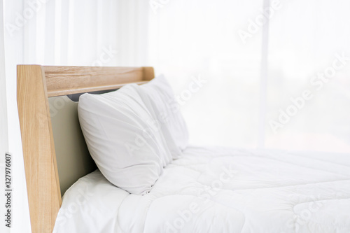decorated with wooden bed placed by white bed sheet. Home and residence furnishing in minimal style. Wellbeing residential estate concept. Restful bedroom, Minimalist decorative style in bedroom