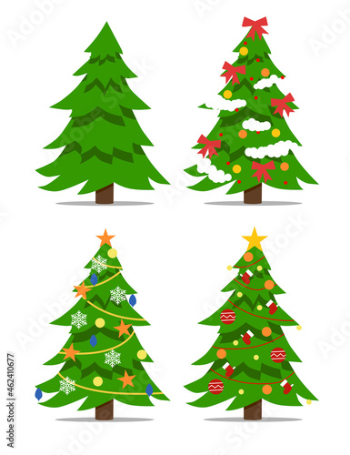Decorated xmas trees. New Years tree with heralds, striped christmas pine. 2020 winter holidays party green fir with garland decoration. Vector illustration