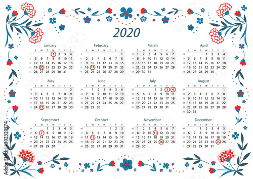 Decorative 2020 year calendar in English language, week starts from Sunday. Vector calendar. - Vector