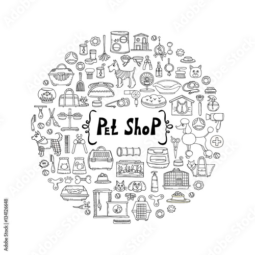Decorative cover with hand drawn goods for pet shop. Vector background for use in design